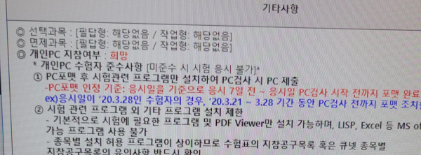 아래는 노트북에 관한 규정이다. 황당하지만 시험날짜를 기준으로 7일 안에 포맷을 하는 것이 규정으로 나와있다. 그러나 지역에 따라 포맷은 안 해도 된다는 메시지가 오기도 한다. 정말 문제가 있다.대체 어쩌라고?