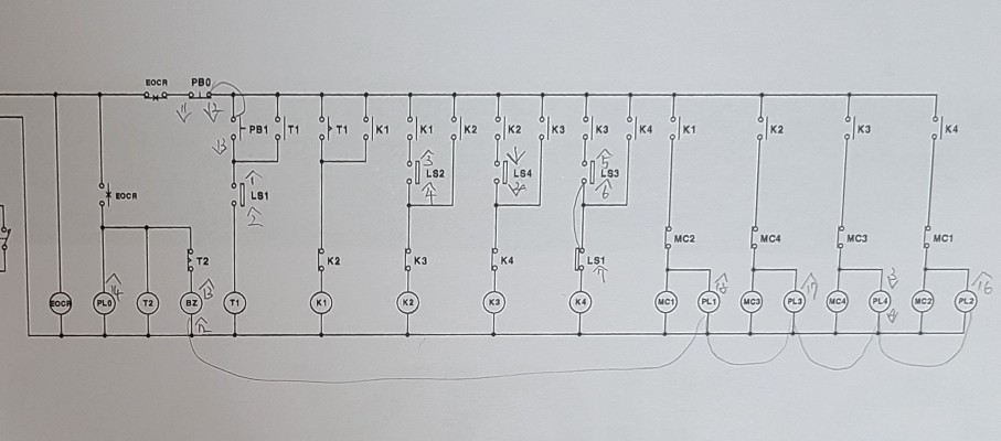 다음으로 순서대로 TB1, BZ 순으로 넘버링을 이어 나갑니다. 하부 단자대도 마찬가지로 진행하며, LS4의 경우 스위치 왼쪽에 a접점을 인지할 수 있게 표시를 해놨습니다. PB0과 PB1도 접속도를 그려놨습니다.