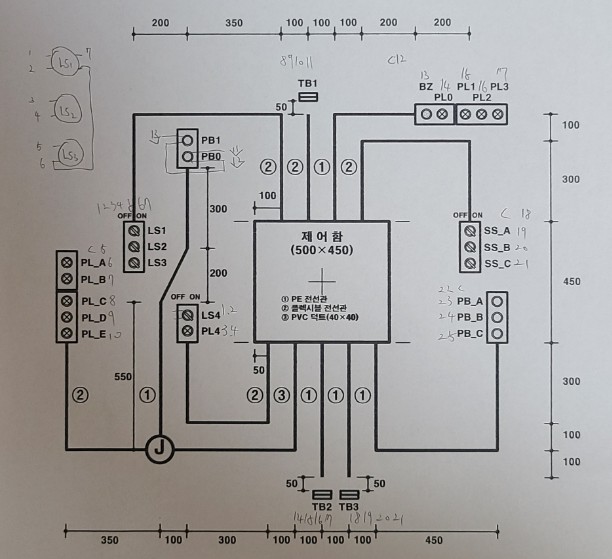 이제 넘버링 연습 과정을 보여드리겠습니다. 먼저 우측 상단의 단자대와 접속할 기구인 리밋스위치 1,2,3부터 넘버링합니다. 저는 위아래 단자대 번호의 구분을 화살표로 하고 있습니다.